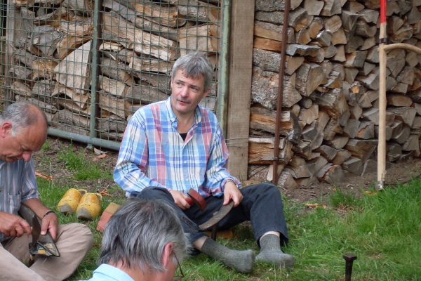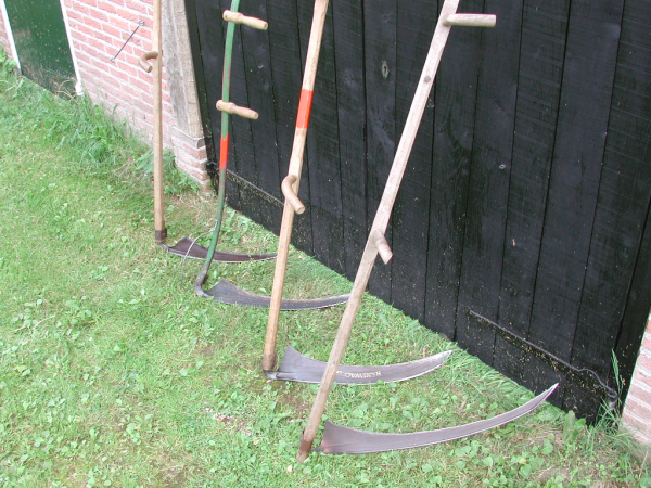 Je maait op de cursus met leenzeisen. Op de cursus wordt advies gegeven hoe je een goede zeis kunt kopen.