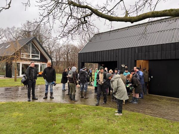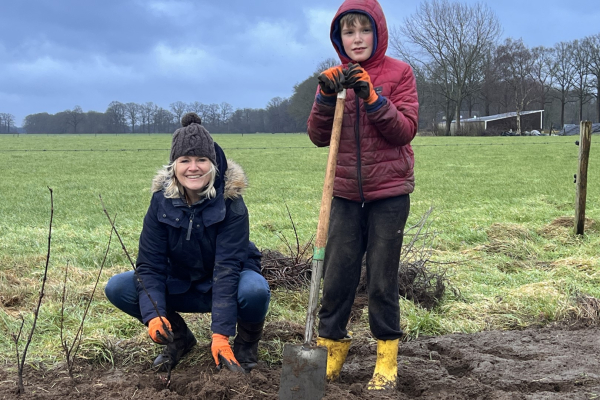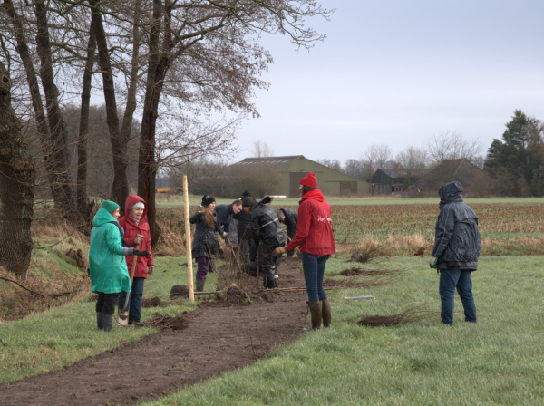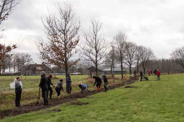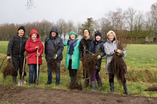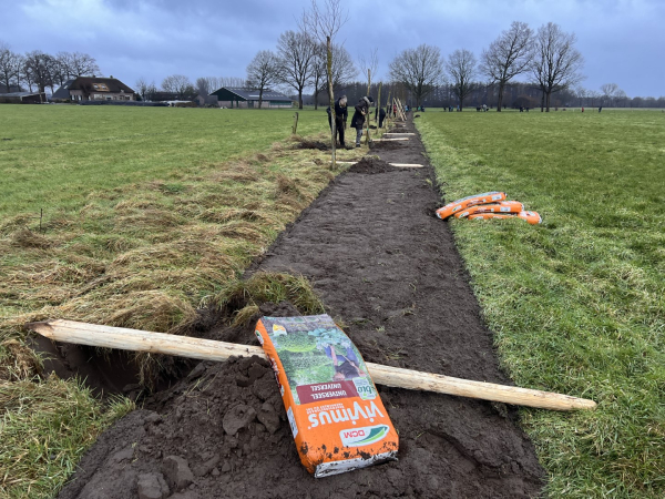 Als ik aankom in Wijhe is het daar een drukte van belang. Meer dan 50 vrijwilligers gaan aan de slag om 700 meter heg en 48 eikenbomen te planten. Een hartelijke ontvangst door de eigenaren van het perceel Rob en Yvonne en voor iedereen staat de koffie en thee klaar!