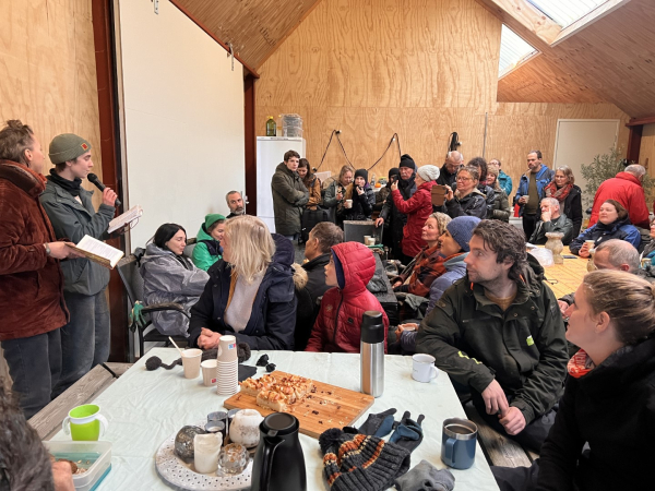 Lieveke Crombach van de provincie Overijssel opent het plantfestijn, dat mede door de provincie Overijssel is georganiseerd. Al vier jaar organiseert de provincie in het kader van het programma 'Natuur voor elkaar' activiteiten om boomaanplant te stimuleren en nu wilde de provincie ook graag eens samen de handen uit de mouwen steken door mee te planten. Er waren dan ook een stuk of 10 medewerkers van de provincie die als vrijwilliger mee hielpen met planten. Ook was de provincie betrokken bij de organisatie van de catering en zorgde voor een leuke culturele aanvulling tijdens de pauze en na het planten.
