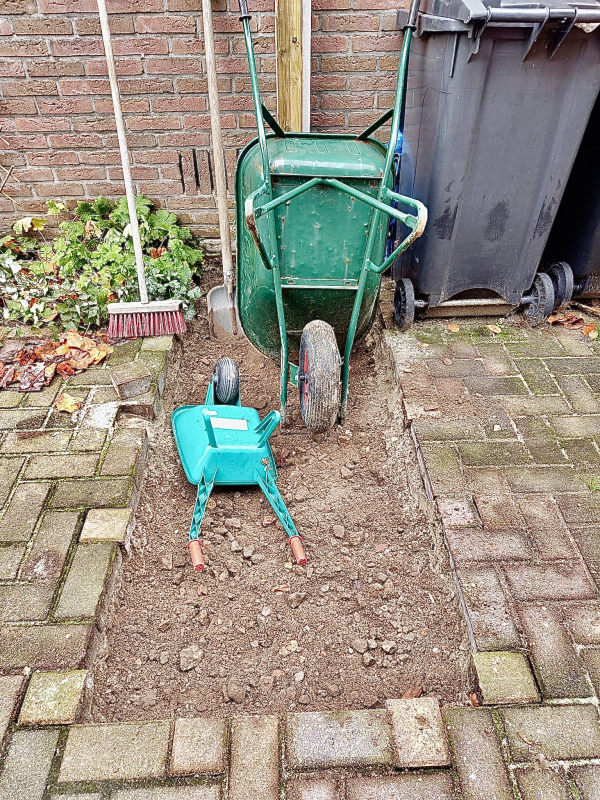 Monique: “Afgelopen juli hadden we al 250 tegels meegegeven aan de tegelophaalservice van de gemeente. Voor dit stukje Tuiny Haag hebben we niet zo veel tegels gewipt, ik denk een stuk of vijftig.”