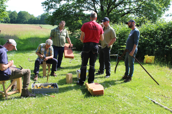 Je maait op de cursus met leenzeisen. Op de cursus wordt advies gegeven hoe je een goede zeis kunt kopen.