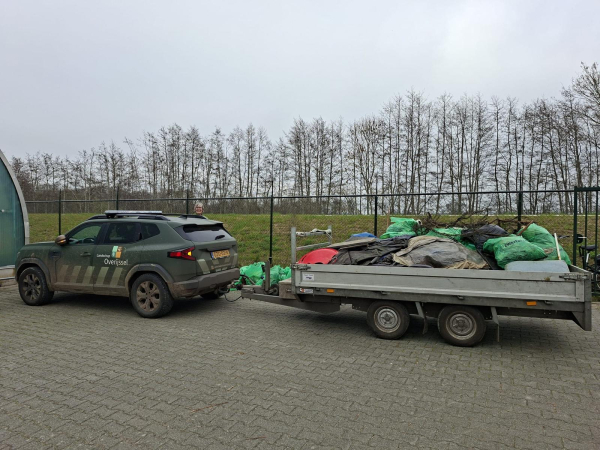 Na een korte briefing door Jeroen Buunen, beheerder van Landschap Overijssel, gingen de vrijwilligers op pad: per boot, te voet en op de fiets. Vanaf de Palestrinalaan tot en met het Haersterveer waren vrijwilligers bezig, met laarzen aan en grijpers in de hand. De opbrengst was gigantisch: een volledige aanhanger vol. Naast het veelal gebruikelijke plastic en piepschuim waren er ook opmerkelijke vondsten. In het Westerveldse bos troffen vrijwilligers bijvoorbeeld een doos met twee dode hanen aan.