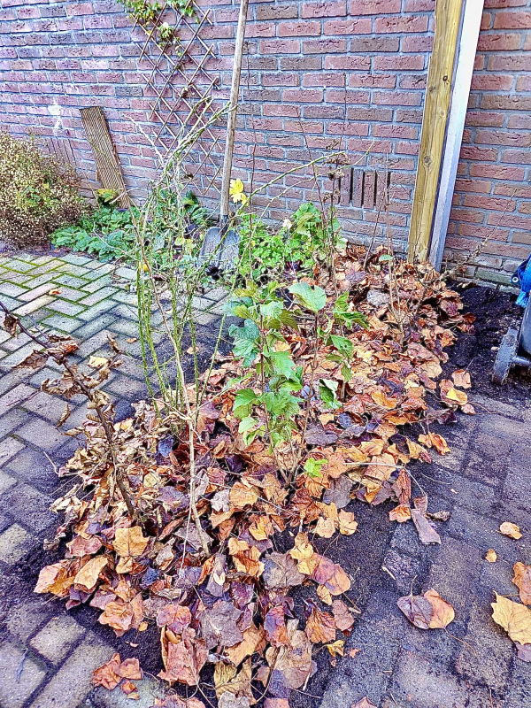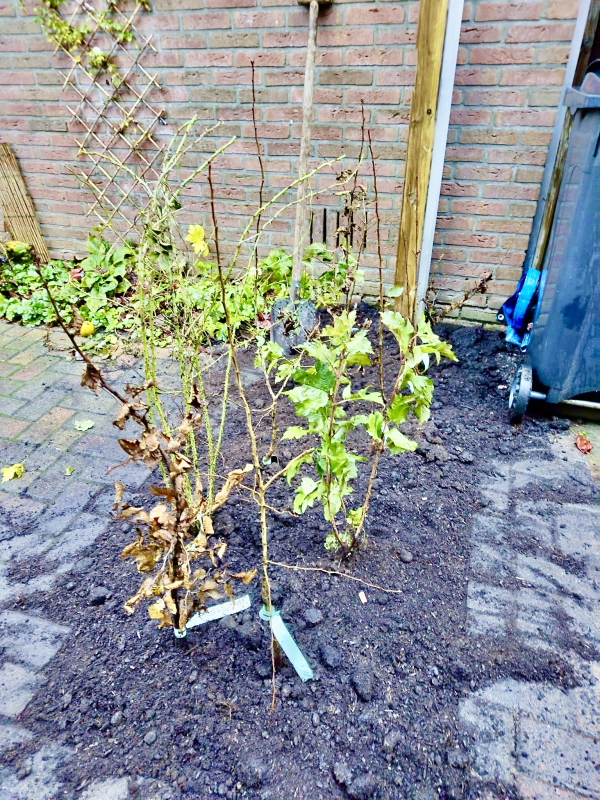 Toch was het nog wel een klusje, vindt Monique. “Eerst hebben we een hoop puin geschept. Daarna moesten er tuinaarde en compost uit onze eigen hotbin in het perk, en daarna de struiken. Op het laatst hebben we nog een laagje mulch aangebracht. Daarvoor hebben we de bladeren gebruikt van de tulpenboom van de achterburen.”